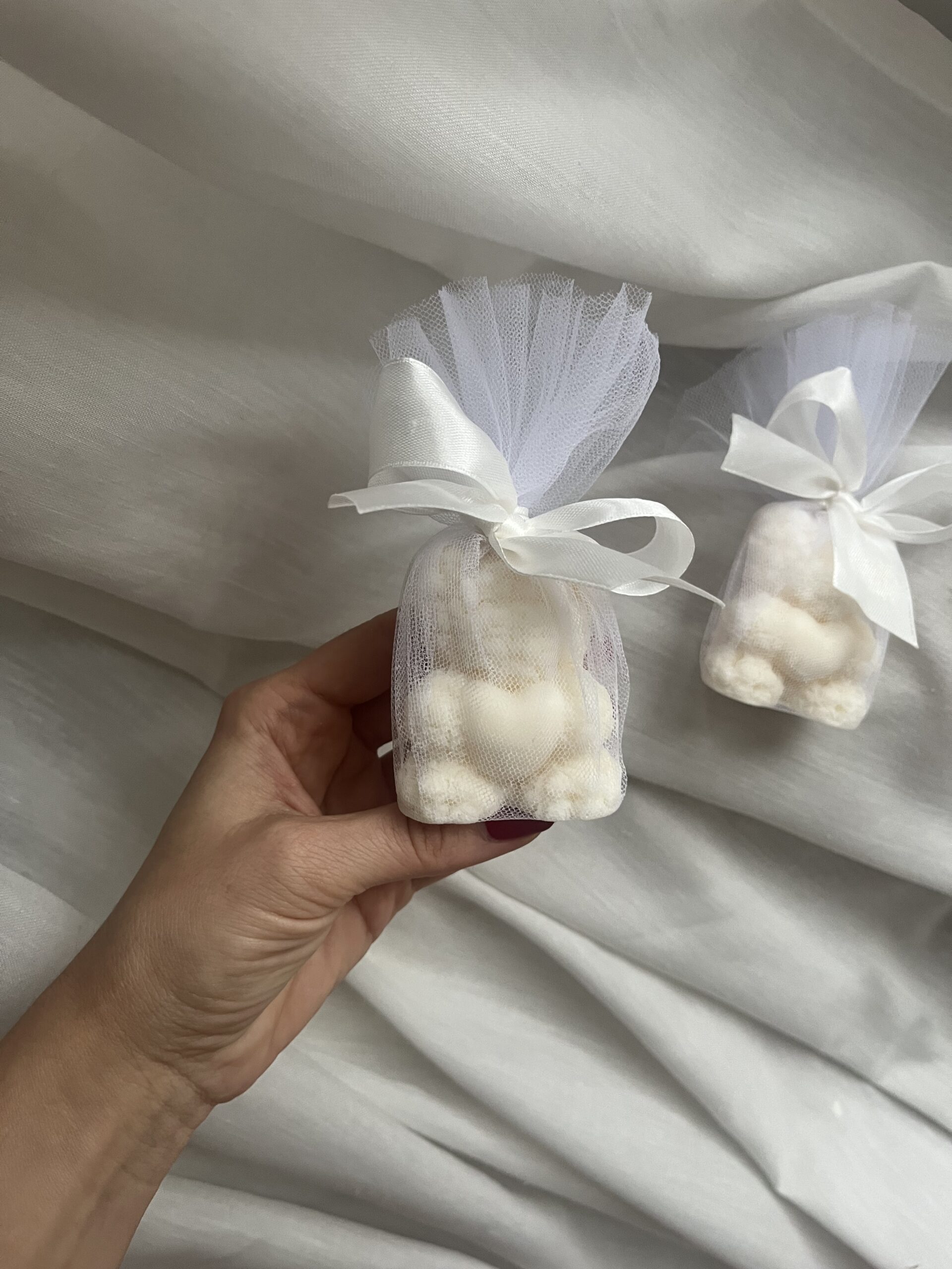 Miś różany z sercem w białym tiulu i perłową wstążką bedzie pięknym wyrazem podziękowania bliskim z okazji wesela, chrztu, komunii, czy innej ważnej uroczystości. To prawdziwy wyraz miłości i sympatii, który dodatkowo pięknie wkomponuje się w dekoracje stołu.