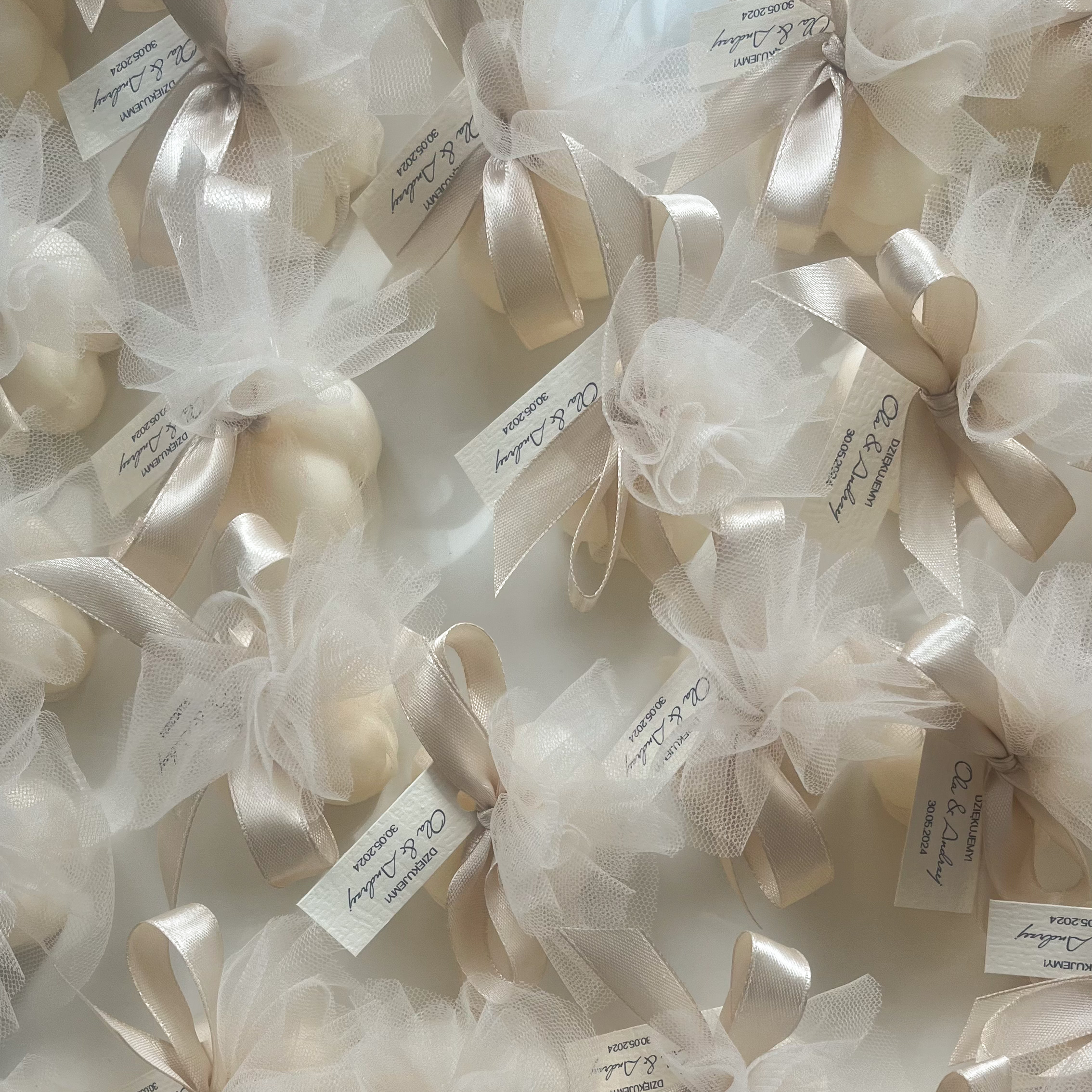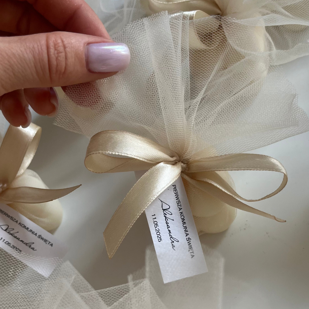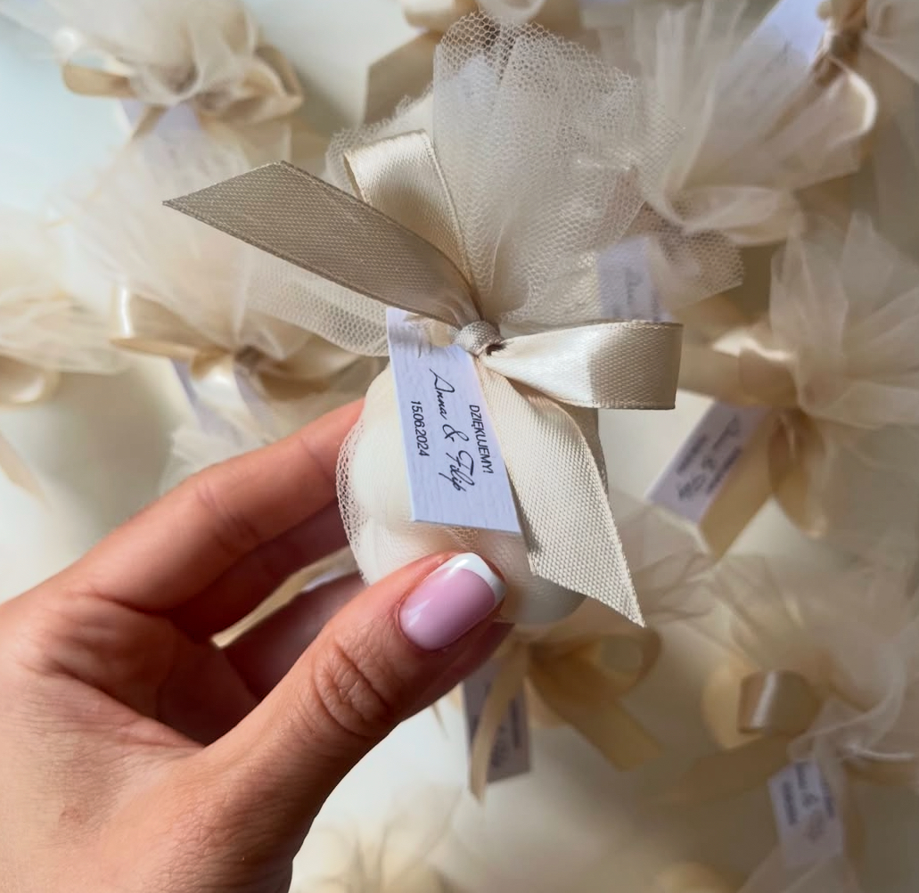 Klasyczna świeca mini bubble w eleganckim tiulu w kolorze delikatnego kremu przewiązana wstążką w szampańskim kolorze to wyjątkowa propozycja podziękowania z okazji ślubu, rocznicy, urodzin, czy innych pięknych uroczystości! ♡