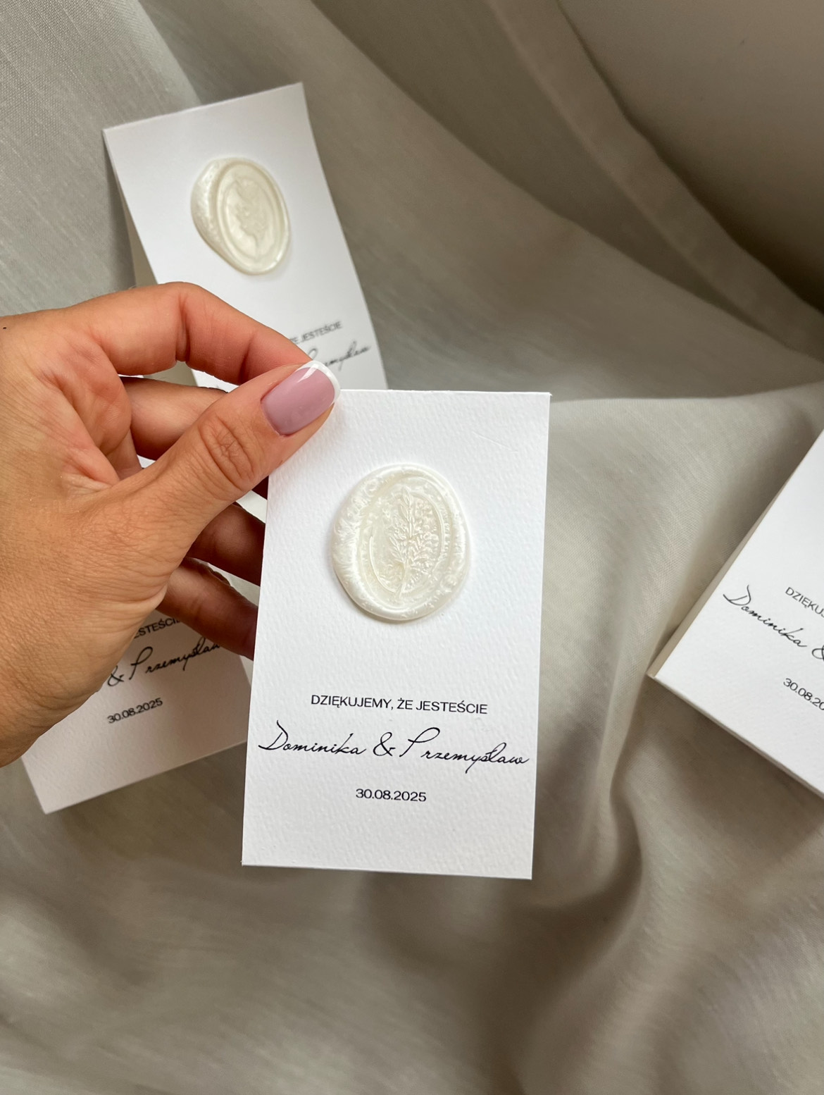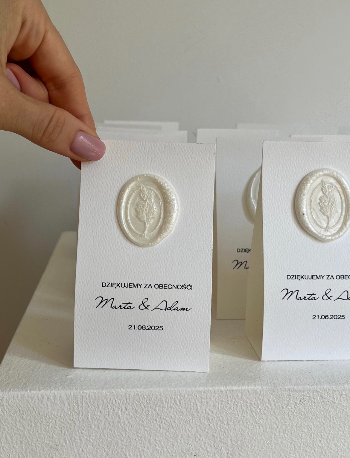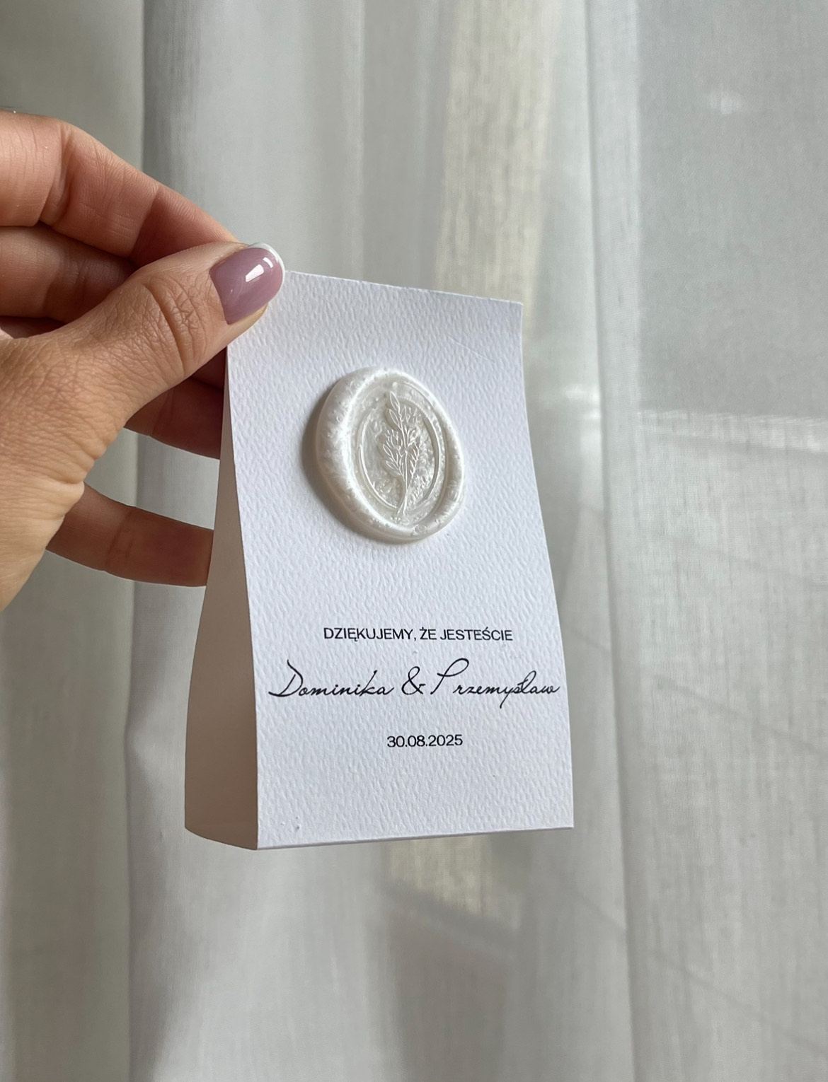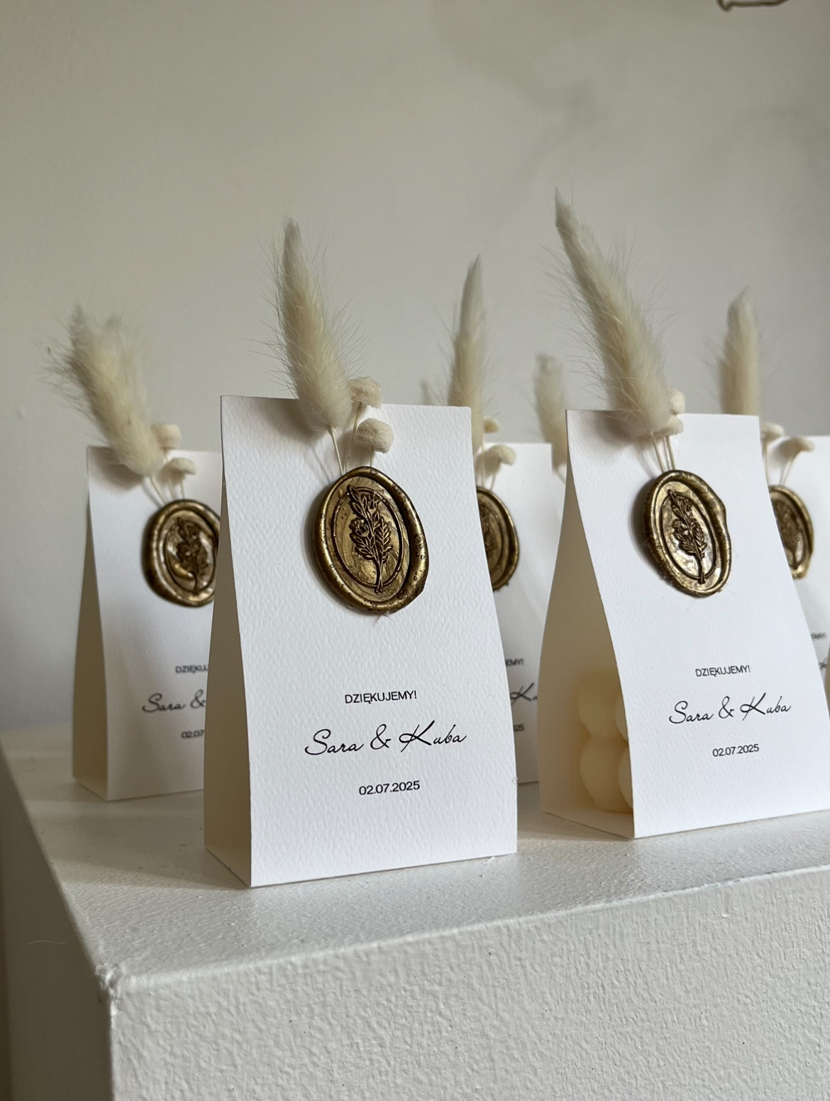 Obwoluta z czerpanego papieru klasy premium z podłużną pieczęcią lakową stanowi idealne zestawienie ze świecą mini bubble. To klasyczne podziękowanie sprawdzi się w wielu stylistykach – klasycznych, boho, rustykalnych, czy glamour. Będzie niezapomnianym upominkiem dla osób bliskich Waszym sercom.