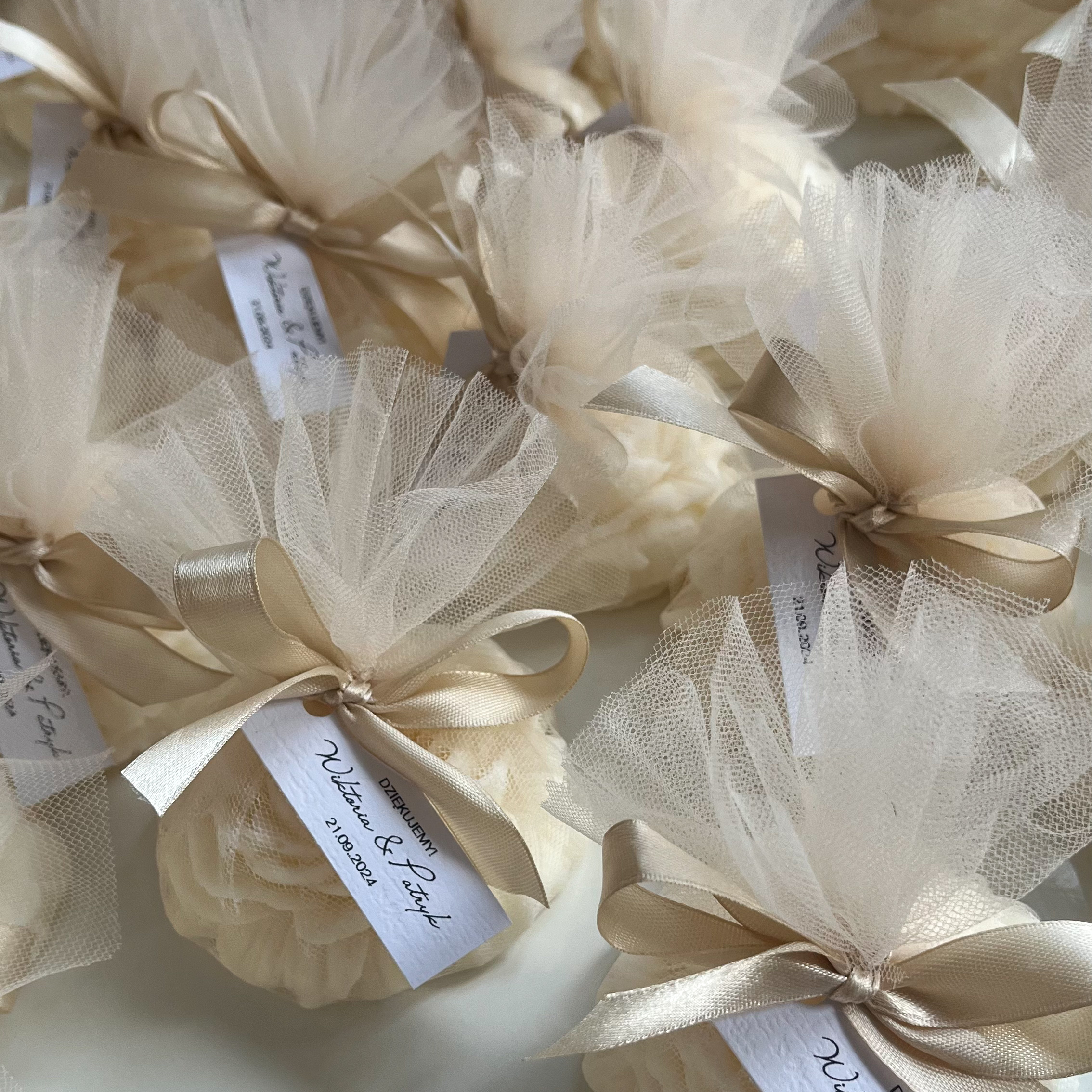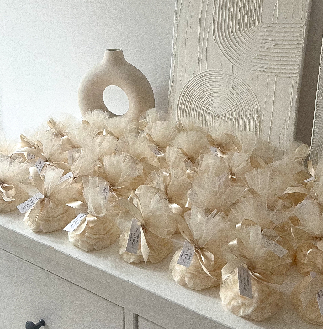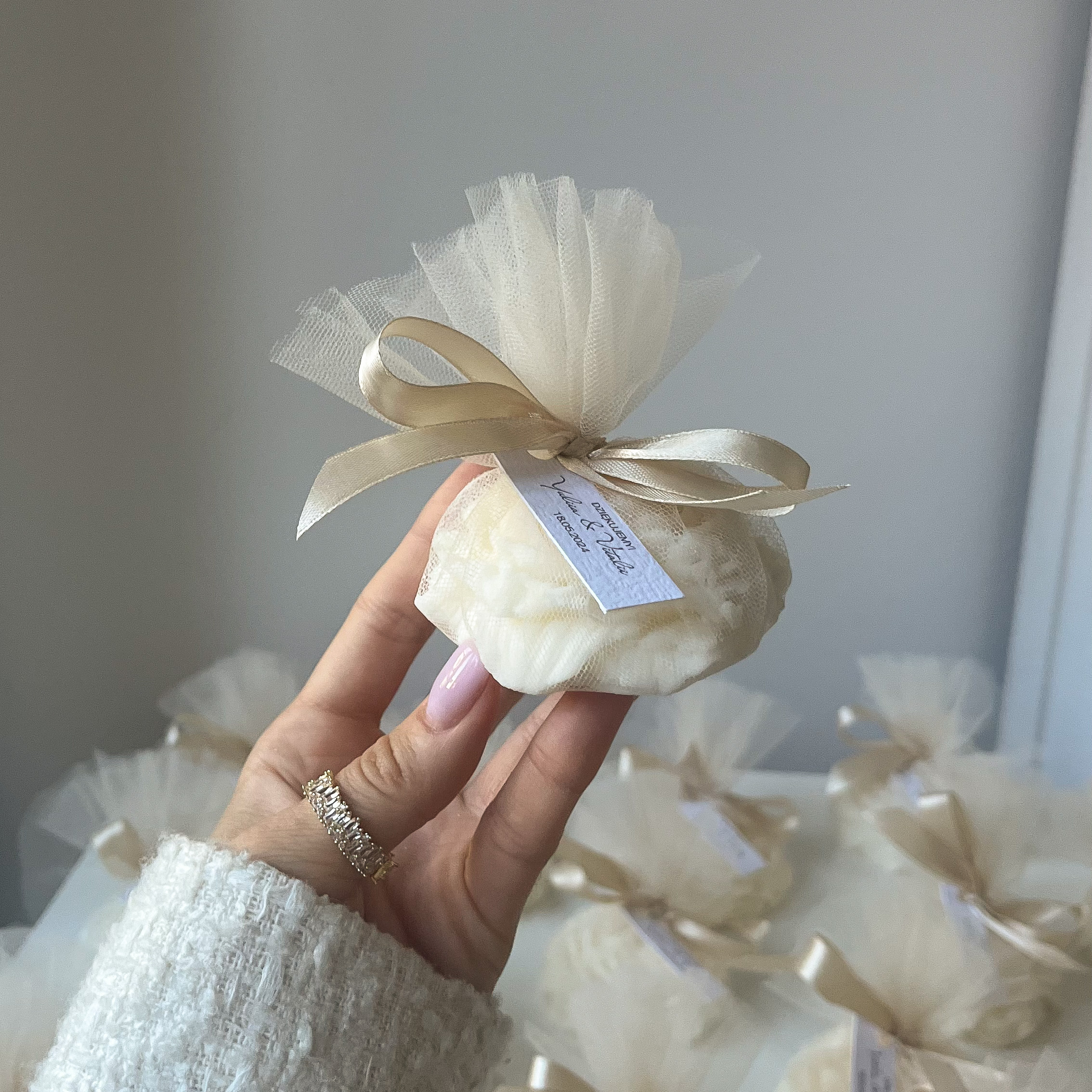 Podziękowanie idealne dla miłośników kwiatowych motywów – piękna świeca w kształcie piwonii opakowana w delikatny tiul oraz przewiązana wstążką w szampańsko-złotym kolorze to wyjątkowa propozycja podziękowania z okazji ślubu, rocznicy, urodzin, czy innych pięknych uroczystości! ♡