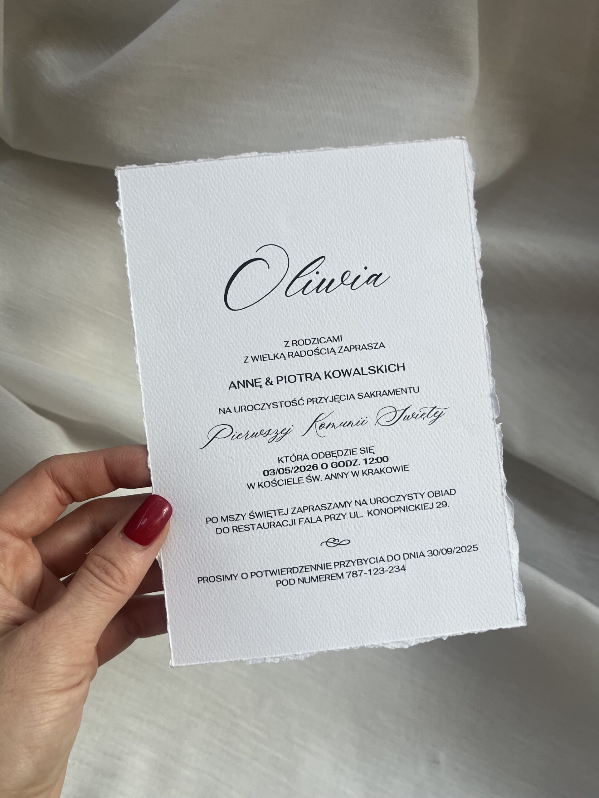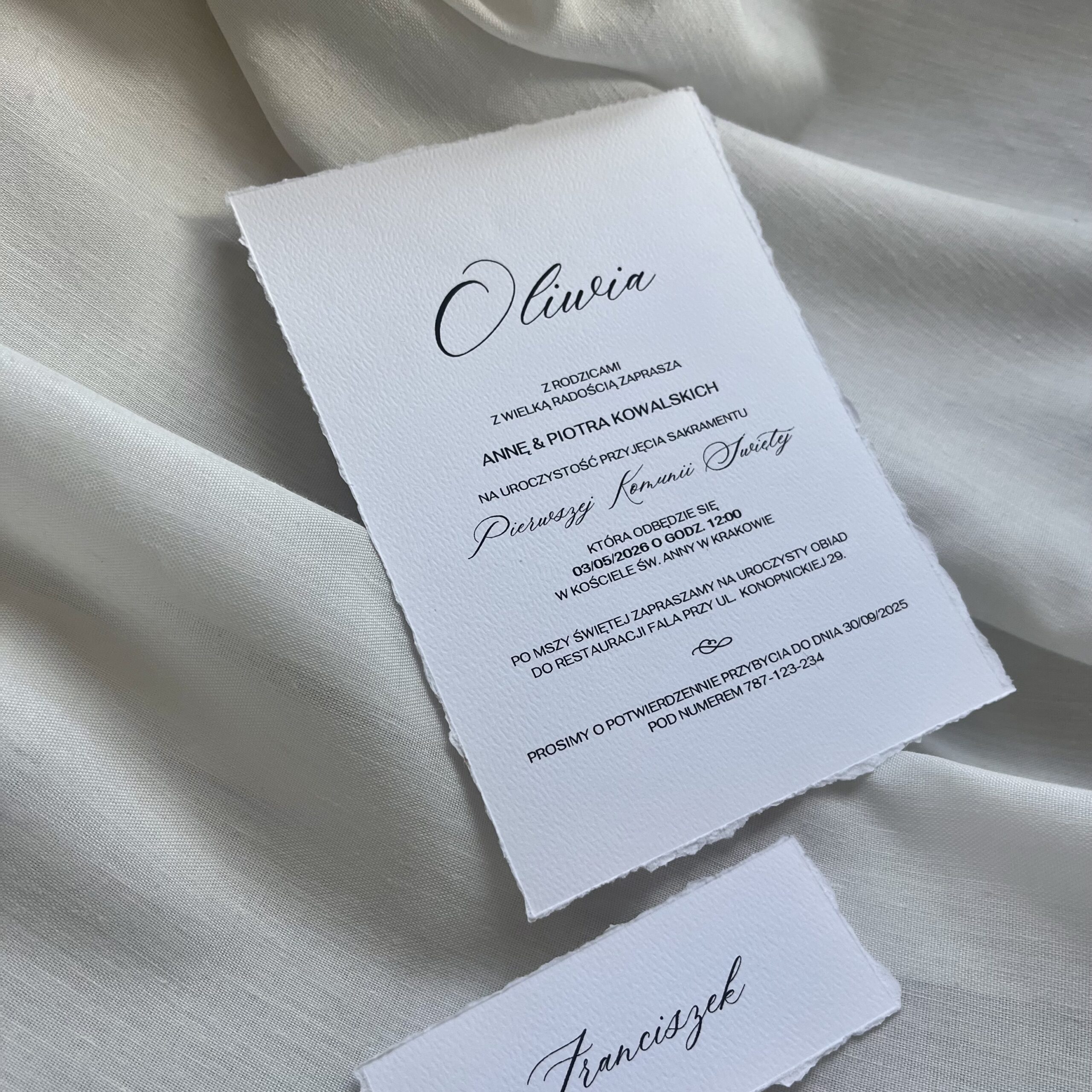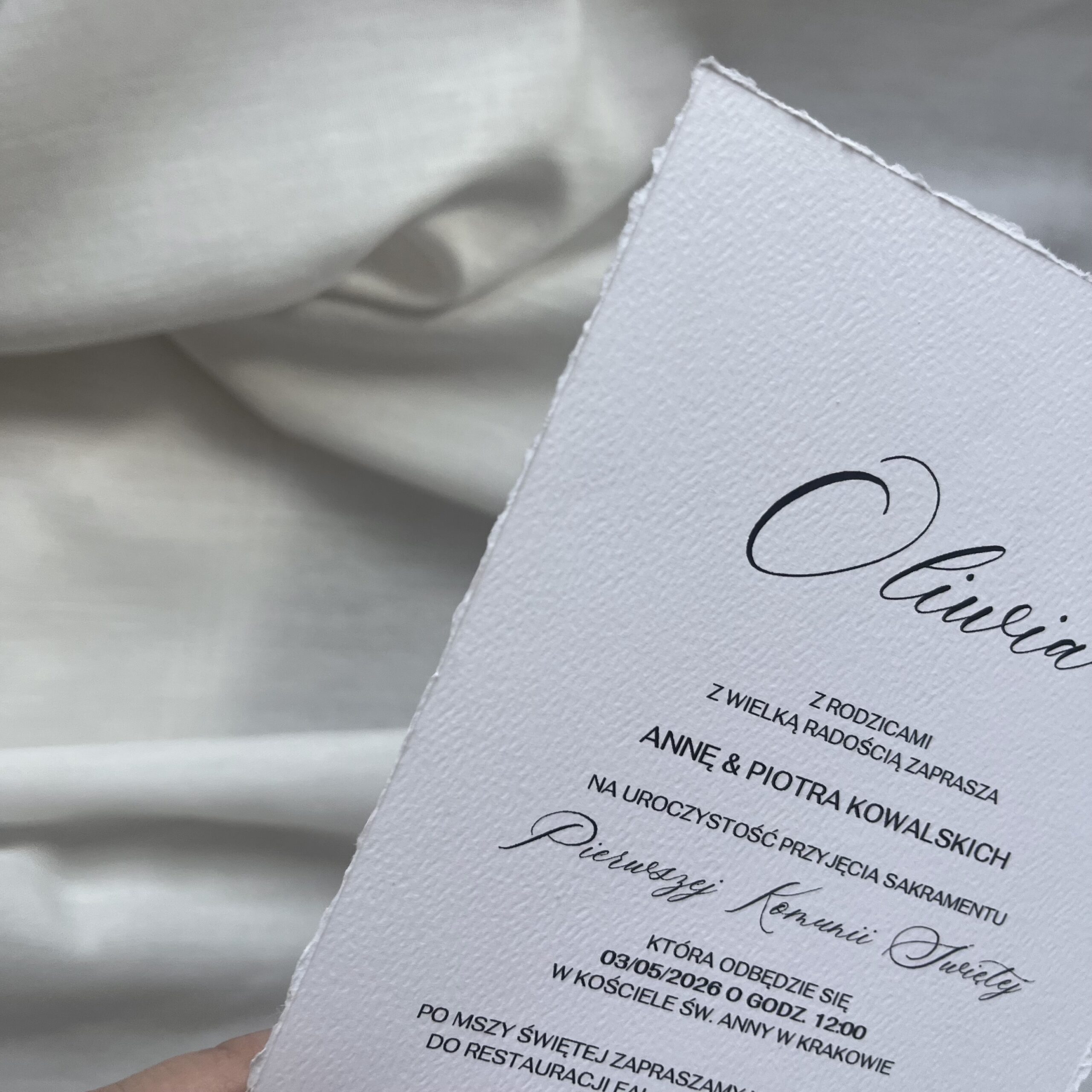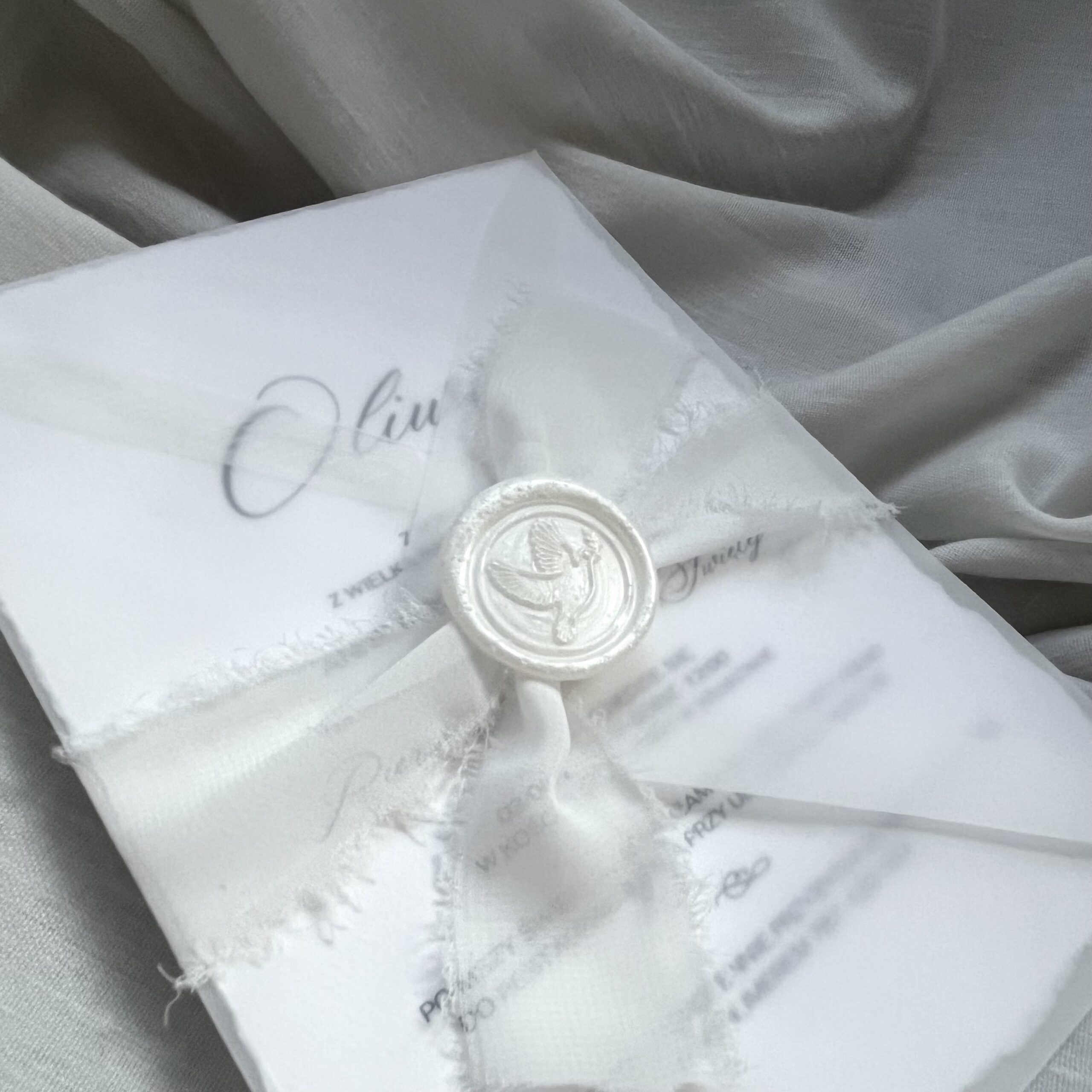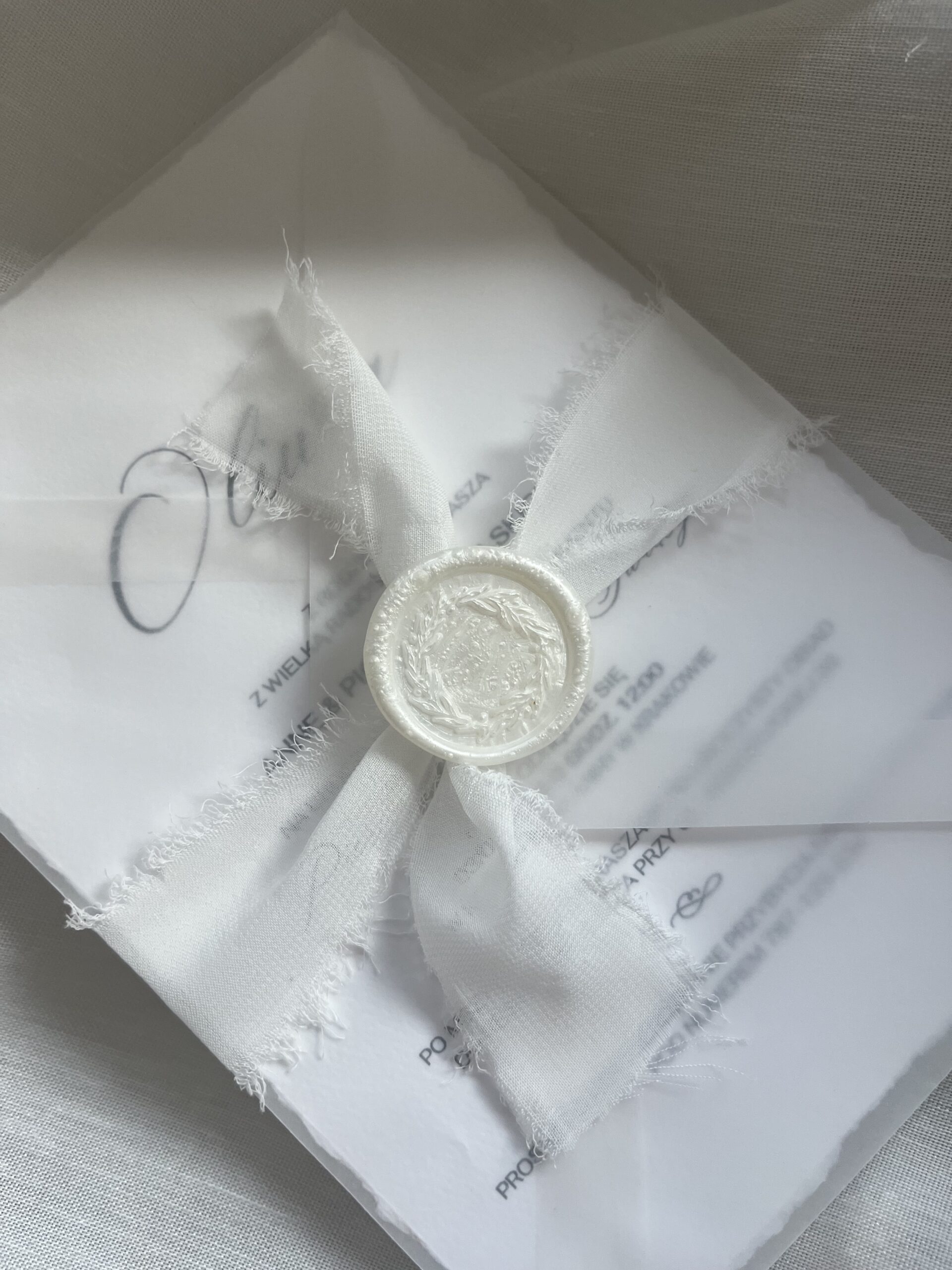Minimalistyczne zaproszenie w rozmiarze około 12×17 cm, na papierze około 230g. Zaproszenie jest dostępne w zestawie z kopertą transparentną, szyfonową wstążką oraz stemplem.